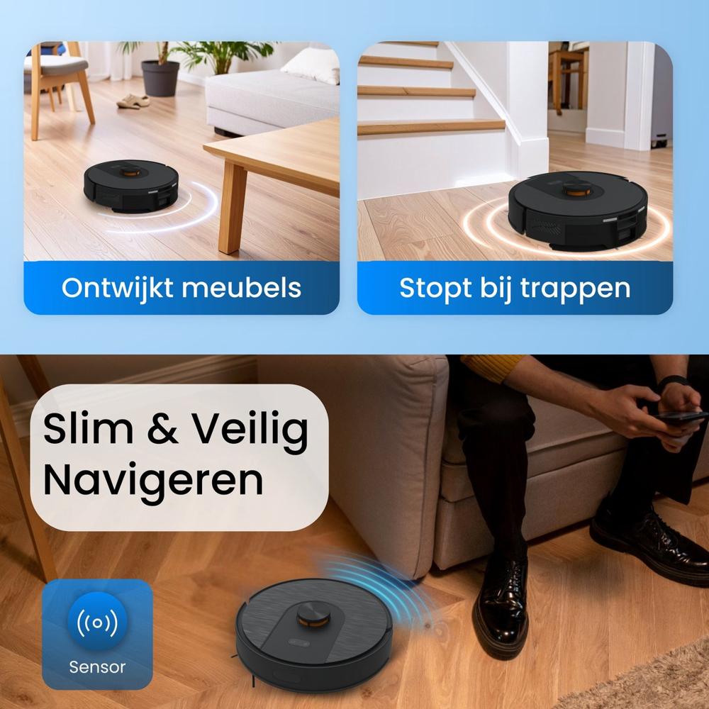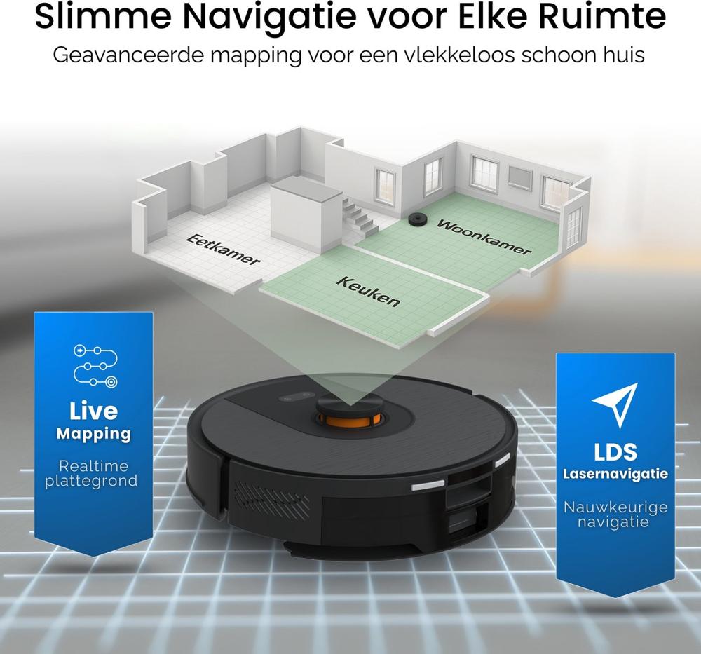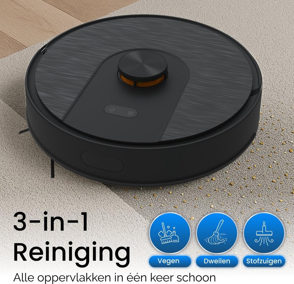 | Belangrijk voor jouw situatie? | Maakt hoekjes schoon, Kan over drempels (2 cm), Loopt niet vast op kabels, Vuildetectie, Afgronddetectie, Voice control, Geschikt voor huisdierharen, Tijdschema instellen, Automatisch opladen en hervatten, Bediening via app |