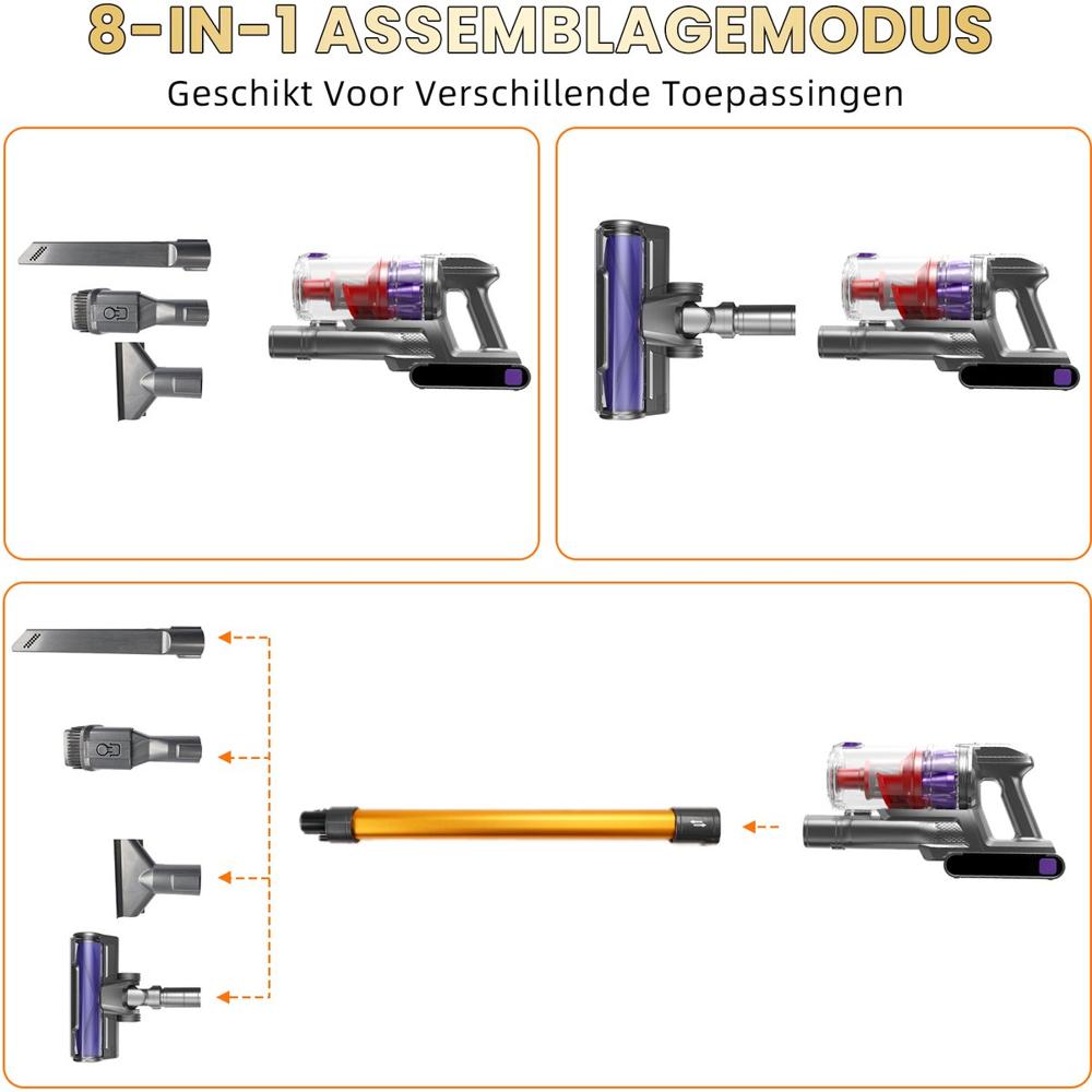 | Verpakkingsinhoud | ✓Filter spons × 4 ✓Brede zuigmond (bedmond) × 1 ✓Adapter × 1 ✓Batterijpakket × 1 ✓Hoofdmotor × 1 ✓Stang × 1 ✓2-in-1 borstel × 1 ✓Langsleufmond × 1 ✓Gebruikershandleiding × 1 ✓Motorborstel × 1 ✓Muurbevestiging + schroeven × 1 ✓2-in-1 reinigingsapparaat × 1 |