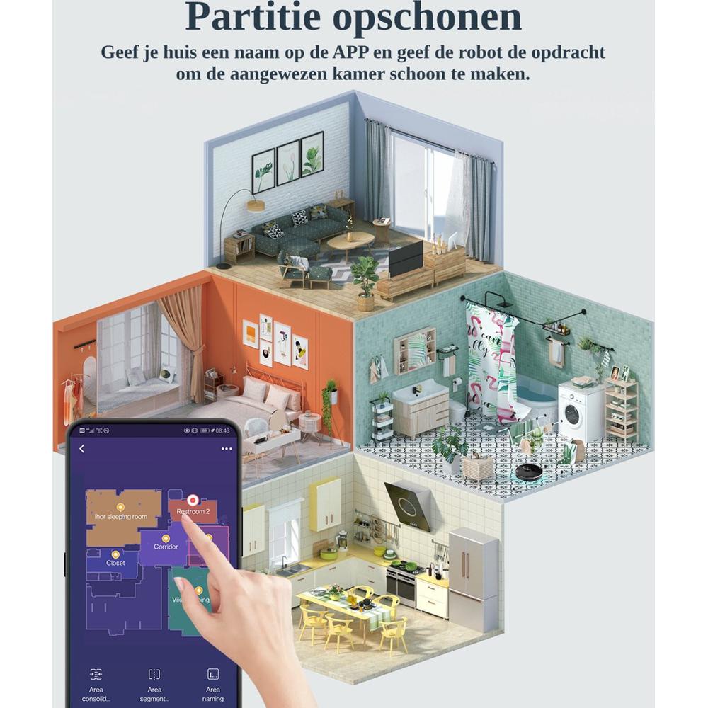 | Belangrijk voor jouw situatie? | Maakt hoekjes schoon, Kan over drempels (2 cm), Loopt niet vast op kabels, Vuildetectie, Afgronddetectie, Voice control, Geschikt voor huisdierharen, Extra stil, Tijdschema instellen, Automatisch opladen en hervatten, Bediening via app |