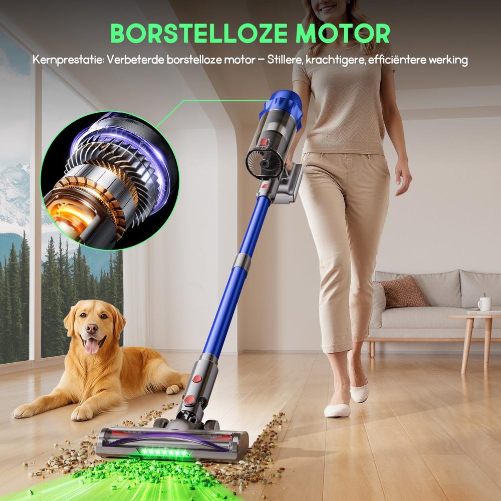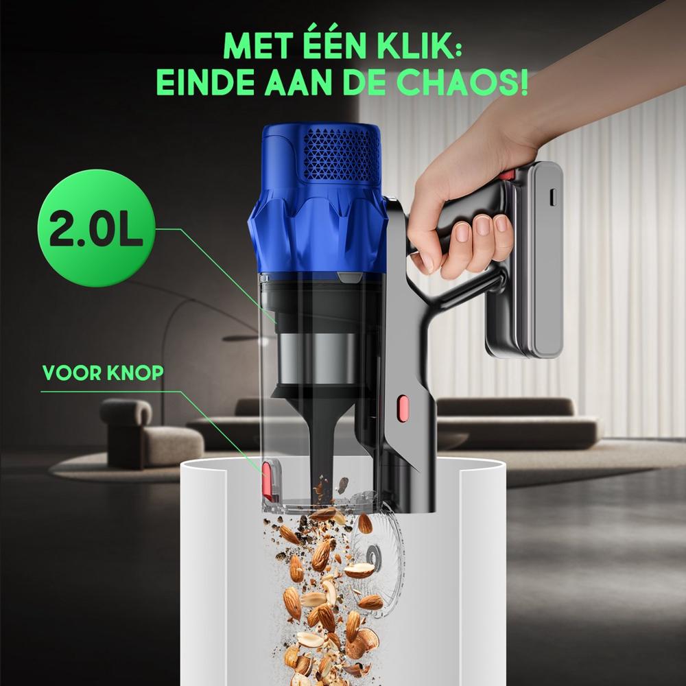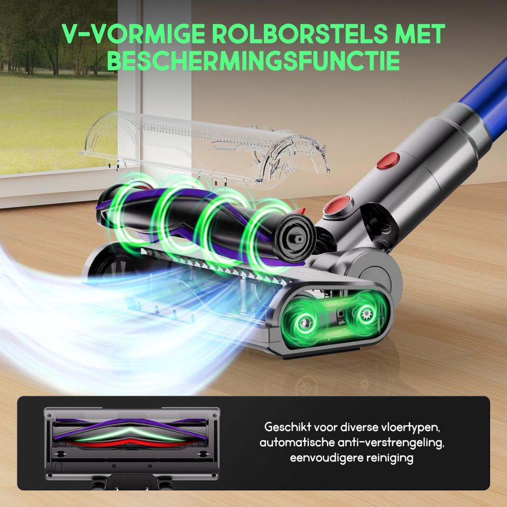 | Verpakkingsinhoud | 1× Steelstofzuiger hoofdunit 1× Uitschuifbare steel 1× V-vormige vloerborstel (anti-verstrikking) 1× Meubelborstel 1× 2-in-1 borstel voor smalle ruimtes 1× Wandhouder + laadstation 4× HEPA-filters (waarvan 1 geïnstalleerd) 1× Reinigingsborstel 1× Accu |