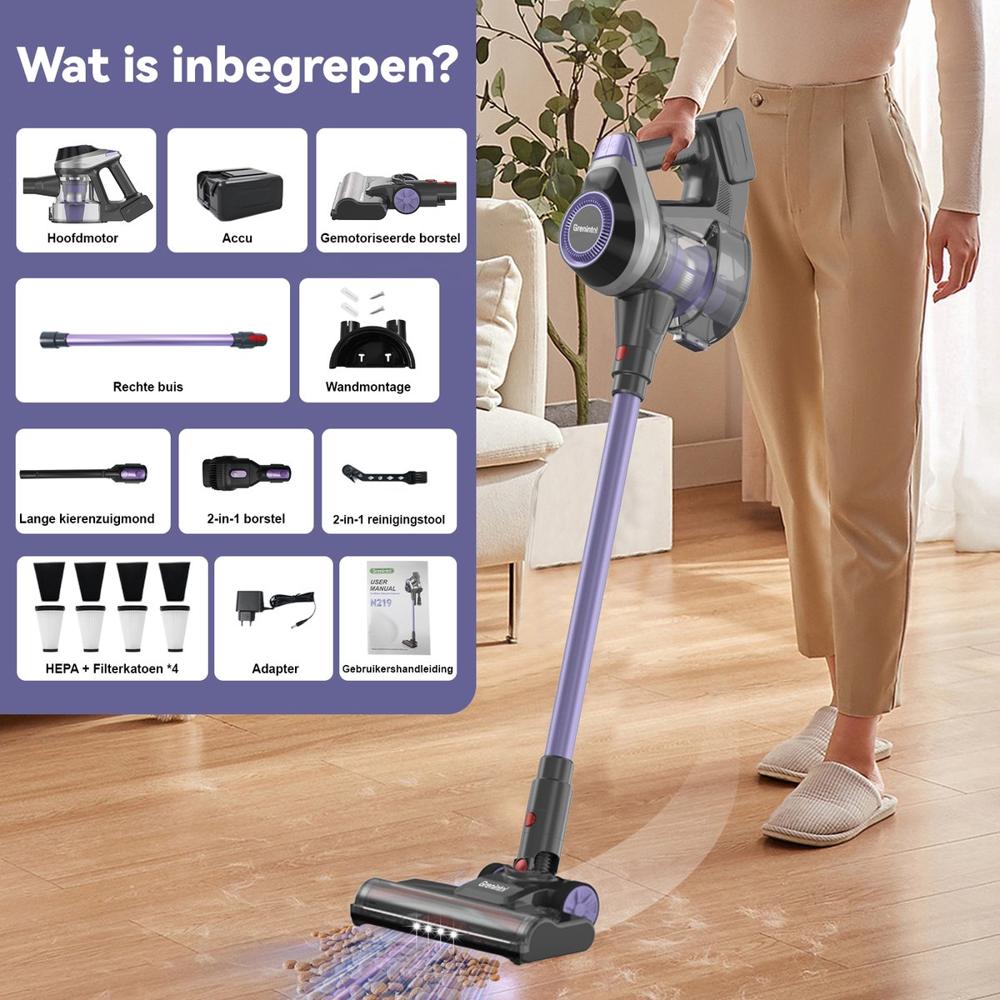 | Verpakkingsinhoud | -Hoofdmotor x1 -Batterijpakket x1 -Gemotoriseerde borstel x1 Rechte buis x1 -Wandmontage x1 -Lange spleetmond x1 -2-in-1 borstel x1 -2-in-1 reiniger x1 -HEPA + filtervlies x4 -Adapter x1 -Gebruikershandleiding x1; |