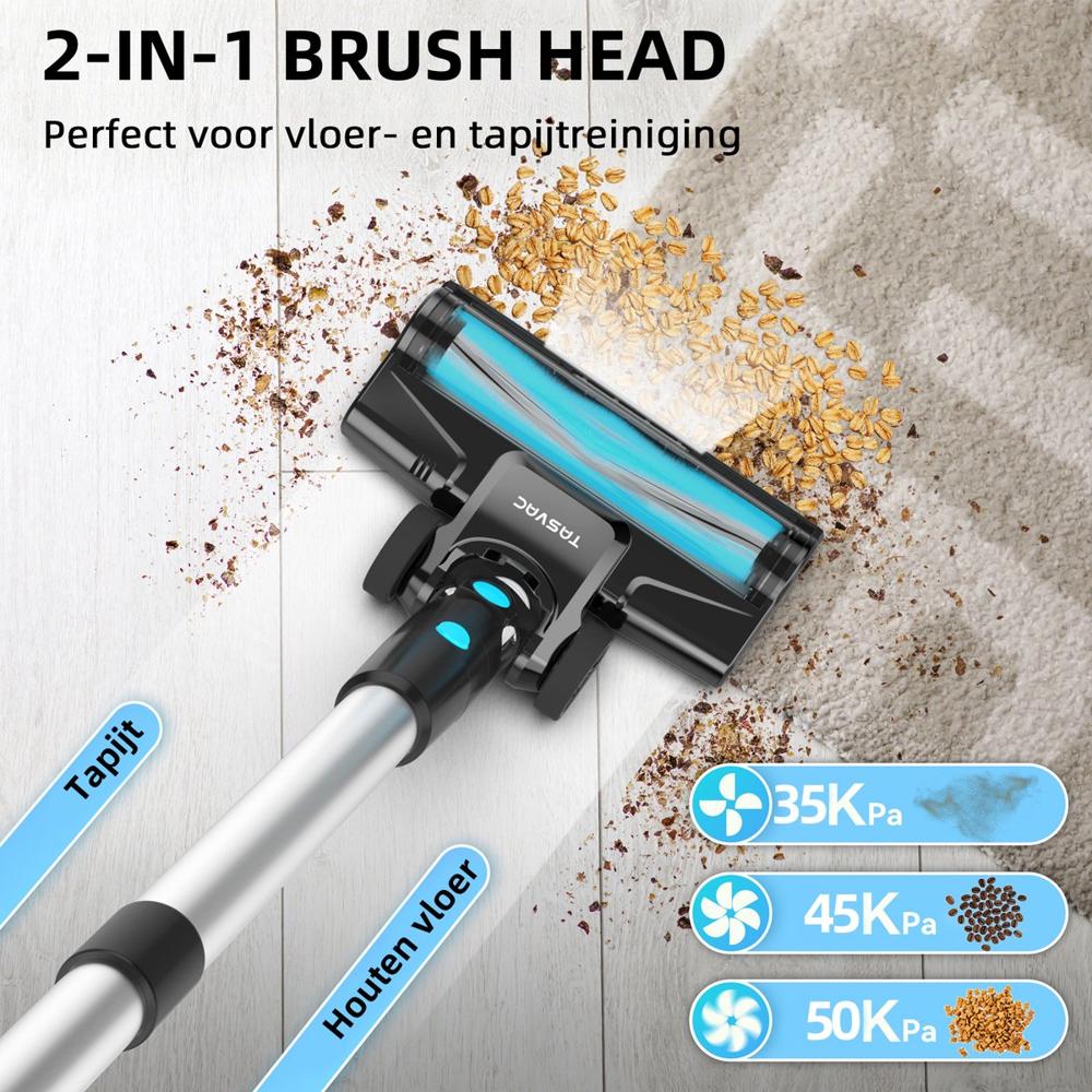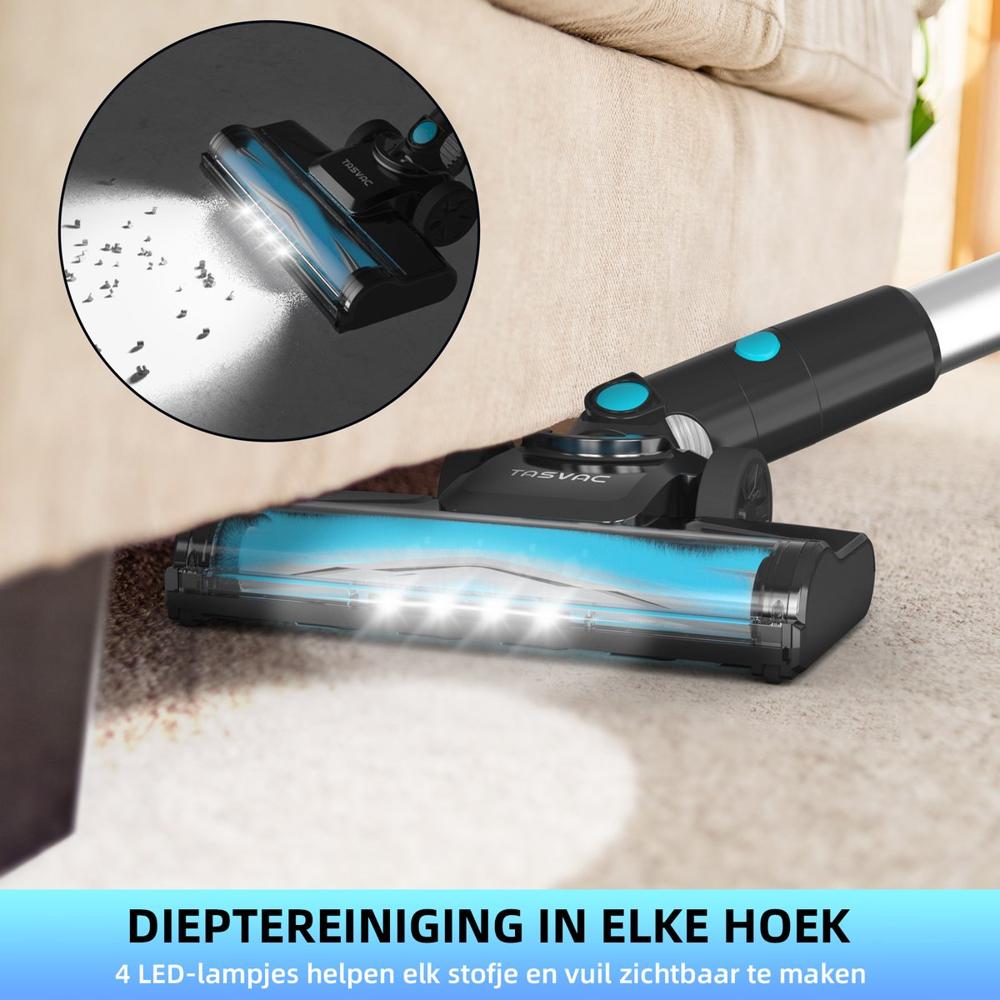 | Handige opties | Met wandmontage, Kan rechtop staan, Zuigmond met verlichting, Geïntegreerde kruimelzuiger |