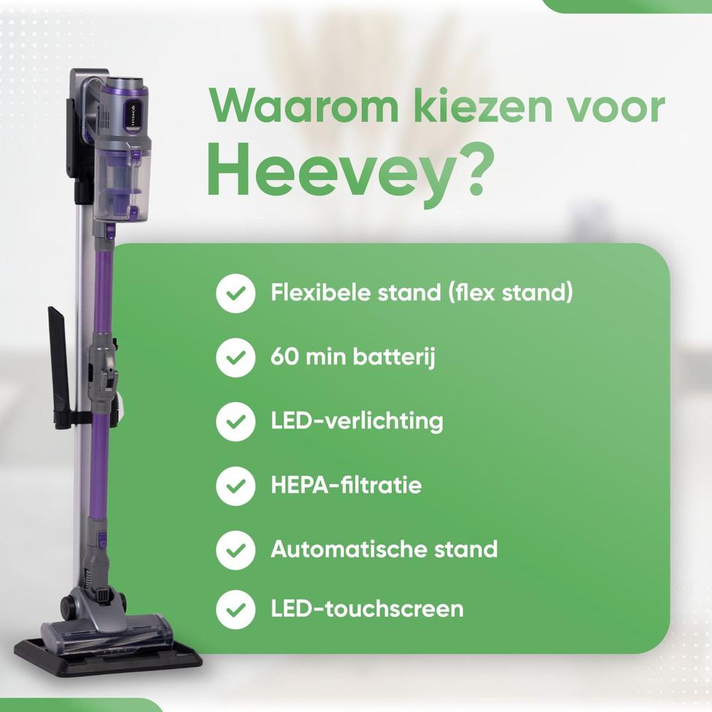 | Verpakkingsinhoud | – Heevey 4-in-1 steelstofzuiger – Kruimelzuiger opzetstuk – Meubelzuiger opzetstuk – Kierenzuiger opzetstuk – 2 HEPA filters – Accu voor de Heevey steelstofzuiger – Standaard voor de Heevey steelstofzuiger |