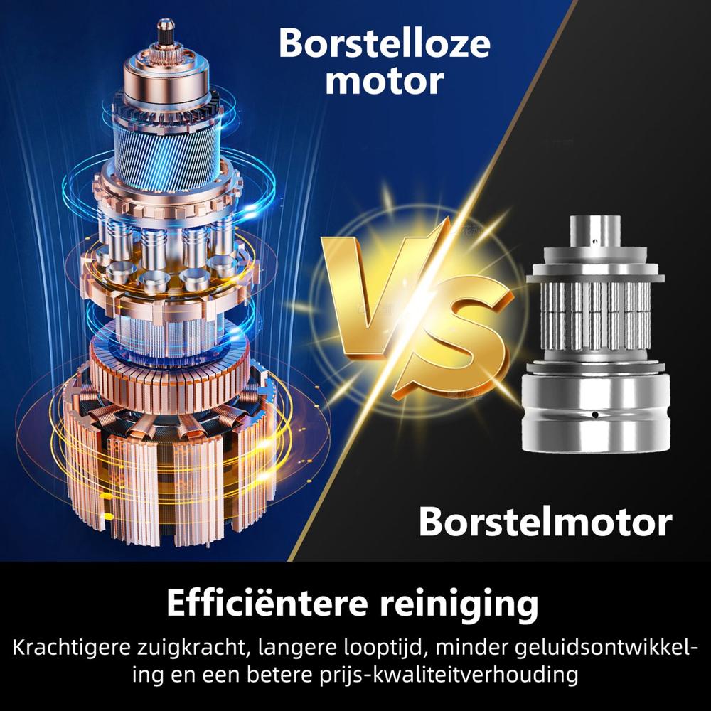 Afbeelding die het verschil toont tussen een borstelloze motor en een borstelmotor, met labels voor beide types. De afbeelding benadrukt de voordelen van de borstelloze motor, zoals efficiëntere reiniging en langere looptijd.