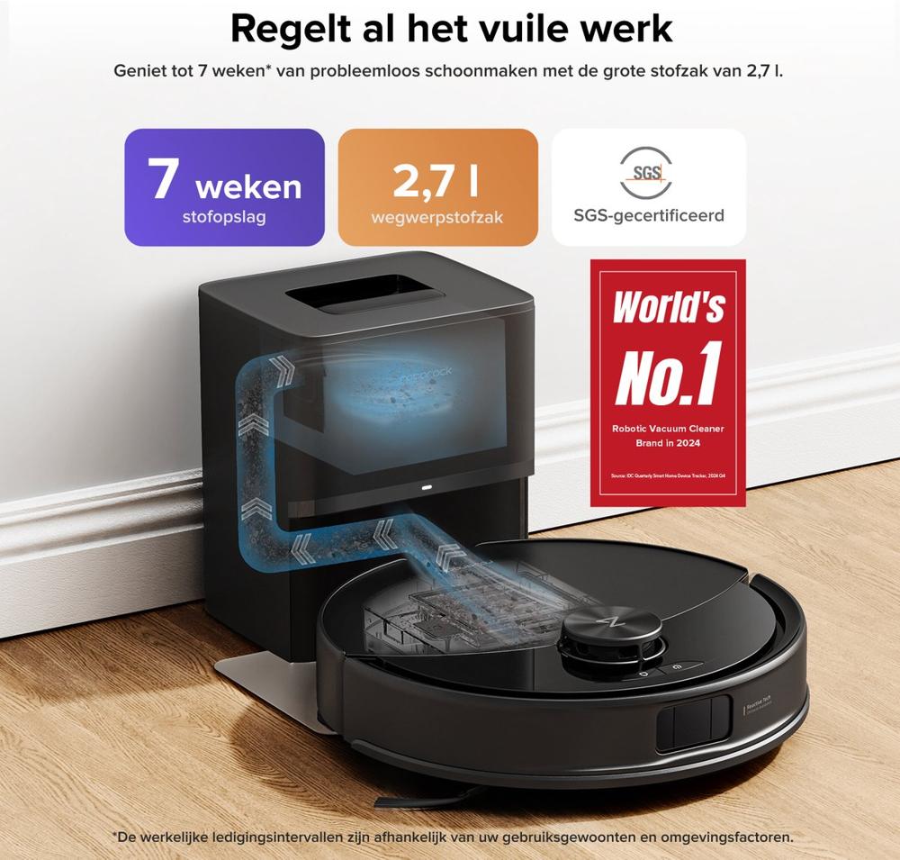 | Belangrijk voor jouw situatie? | Maakt hoekjes schoon, Kan over drempels (2 cm), Loopt niet vast op kabels, Vuildetectie, Afgronddetectie, Voice control, Geschikt voor huisdierharen, Tijdschema instellen, Automatisch opladen en hervatten, Bediening via app, Met reinigingsstation |