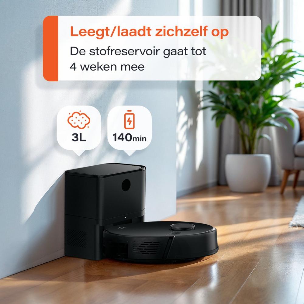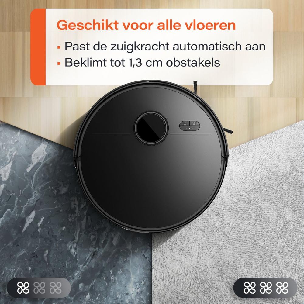 | Belangrijk voor jouw situatie? | Maakt hoekjes schoon, Loopt niet vast op kabels, Vuildetectie, Afgronddetectie, Geschikt voor huisdierharen, Tijdschema instellen, Automatisch opladen en hervatten, Bediening via app |